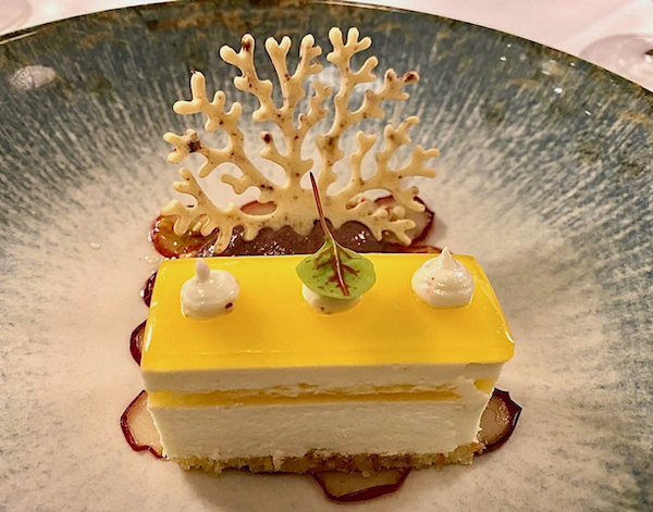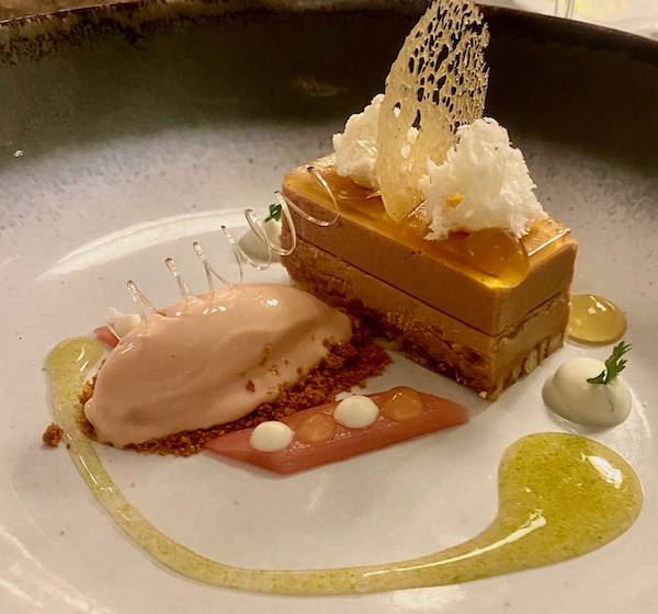 Ein Universum für sich sind weiße Châteauneuf-du-Pape, der cremige und auffrischend meersalzige Beaucastel Roussanne Vielles Vigne  2022 ist durch seine poetische Kraft und all seinen aufregend flirrenden Aromen ein Weltereignis. So eine Flasche kostet rund 250 €, was nicht wenig erscheint, angesichts dieser Rarität aber angemessen ist. Die Terrine von französischem Ziegenkäse mit violettem Senfeis an Trauben-Pinienkernsalat und Rosa Pfeffer nahm den Wein harmonisch in den Arm, wobei sich die Küche sehr viele gute Gedanken zum idealen Pairing machte.