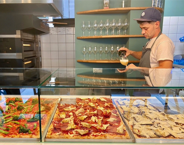 Im Gegensatz zur neopolitanischen Pizza wird die römische länger gebacken und fällt dünner und knuspriger aus. Sie ist auch nicht rund und wird in viereckigen Stücken serviert. Im Ciccione teilt man sich am besten zwei Slices zu jeweils 7 € und erhält dadurch zwei verschiedene Pizzavarianten, die völlig ausreichend sind. Die Weinauswahl ist gut, für eine Pizzeria  erstaunlich gut. Der gerade ins Sortiment aufgenommene Riesling von Becker Landgraf aus Rheinhessen ist ein puristischer, klarer und frischer Riesling, den man nicht nur als Aperitif trinken kann.