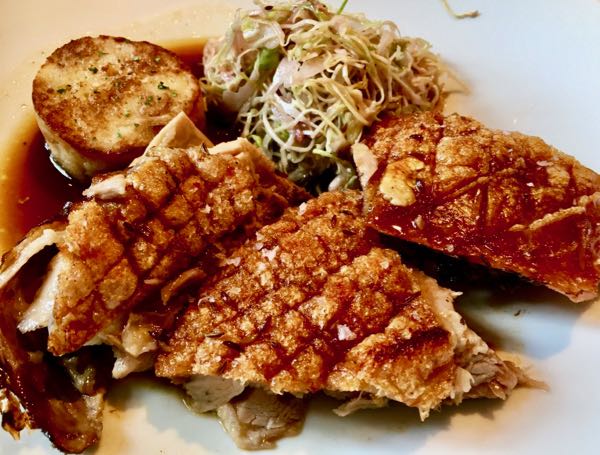 Der frisch aufgeschnittene Schweinsbraten dampft verlockend. Superbe Saftigkeit mit krachiger Kruste und schmelzige Semmelknödel. Mehr Schwein kann kein Gast haben. Diese famose Herzhaftigkeit stammt vom Schwäbisch Hällischen Landschwein aus dem Hohenloher Land. Beste Bio-Qualität. Dazu gibt es auch noch einen feinst gekümmelten, Engelshaar gleichen und mit gutem Öl und Essig verfeinerten Krautsalat, der allein schon Statur für eine Hauptrolle hat.
