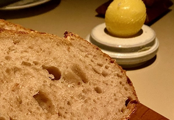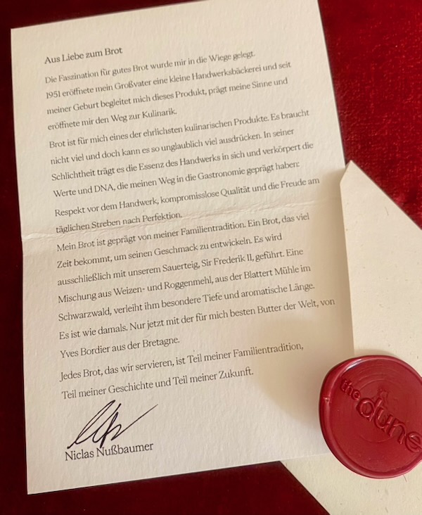 Beim Menü erlebt man es derzeit in einer liebenswerten Form: Das Brot kommt in einem versiegelten Briefchen an den Tisch, in dem schön formuliert steht, welches Handwerk in dieser Krume und der Butter steckt.