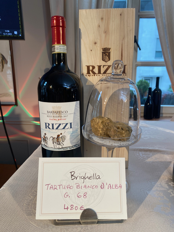 Bei den Gästen des Restaurants Brighella ging es einige Nummern kleiner zu, aber nicht weniger spannend. Mario Borazio vom Brighella, der ja auch Theaterschauspieler ist, bewies hierbei sein Talent als Auktionator und entlockte den Bietern jeweils ein hübsches Sümmchen, wobei es fünfmal jeweils ein Paket aus Alba-Trüffel und Piemont-Rotweinen in Big Bottles gab. Dietrich Eilers vom Sonnenhof war einer der Glücklichen, der trotz heftiger Konkurrenz einen Trüffel von 77 Gramm und einen Barolo für 888 € ersteigerte.