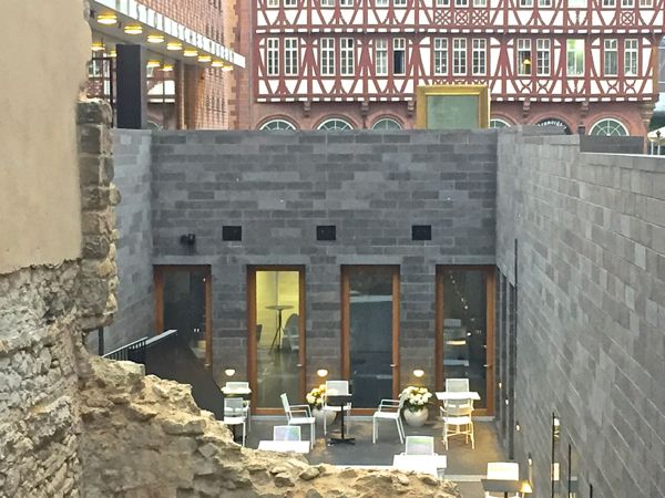 Terrasse: 35 Plätze unter den Arkaden mit Blick auf die Piazza mit Wasserspielen, Skyline, den Main und Sonnenuntergänge