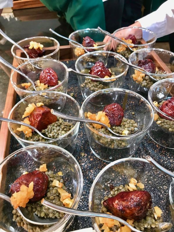 Die Gäste des Tapas-Festivals genossen Traditionelles wie die Krokette vom Joselito-Schinken mit Petersilie und Aioli, Feines à la Ceviche vom Kingfish mit Gurke, Apfel und Jalapeno sowie Amadors großen Klassiker, die Mieral-Taube mit Kokos, Mango und Purple Curry. Einen Teil der Gerichte schickte Ingo Holland, den anderen Juan Amador. Jeder Biss war ein Genuss, doch einige Tapas-Teller glänzten noch mehr durch eine herausragende Geschmackstiefe: Der qualitativ hochwertige Barcelona-Bacalhau im würzigen Chorizomantel auf saftigen weißen Bohnen mit schwarzem Oliven-Crunch von Ingo Holland zeigte, wie großartig spanische Küche sein kann, die wir in Deutschland aber leider vermissen müssen. Die Potenz zum großen Klassiker offenbarte Juan Amadors geniales Österreich-Schmankerl, der gewürfelte Kalbstafelspitz mit Semmelkren, Senfgurke und Pilzen.