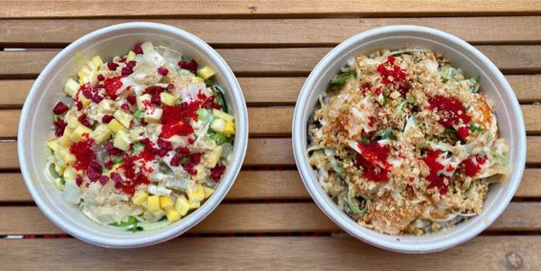 Egal, welche von den aufgelisteten Bowls man wählt, sie sind harmonisch bestens aufeinander abgestimmt und schmecken ausgezeichnet. Bei „Gangnam Hottest“ erlebt man ein schönes Zusammenspiel aus Yakitori-Chicken, Garnelen, Kimchi-Aioli, Gurke, Tomaten, Blaubeeren, Röstzwiebel, Goji-Beeren und Mango. Die U-Special-Bowl  zeigt ebenfalls Klasse: Gebratenes Beef, Tobiko-Kaviar, Maracuja-Erdnuss-Sauce, Frühlingslauch, Jalapeño, Karotten-Chutney, Ananas, Kokosnuss-Chips, Quinoa Pops. Man kann sich aber auch aus allen offerierten Einzelteilen seine persönliche Bowl zusammenstellen und könnte schon mit dem guten Sushi-Reis und der intensiven Kabayaki-Sauce glücklich werden. Die Saucen muss man einfach mögen, ob Wasabi-Teriyaki, Yuzu-Kimizu oder Ponzu-Tonkatzu, alle hausgemacht. Ich liebe vor allem die substantiellen Protein-Komponenten: Flambierten Lachs, Yakitori-Hühnchen oder japanischen gegrillten Aal, die man sich ganz einfach mit wenigen Zutaten auch ohne Obst und Toppings bestellen kann. Ab 9,80  ist man dabei, es gibt nur wenige Tische, auch deshalb alles als Take Away.