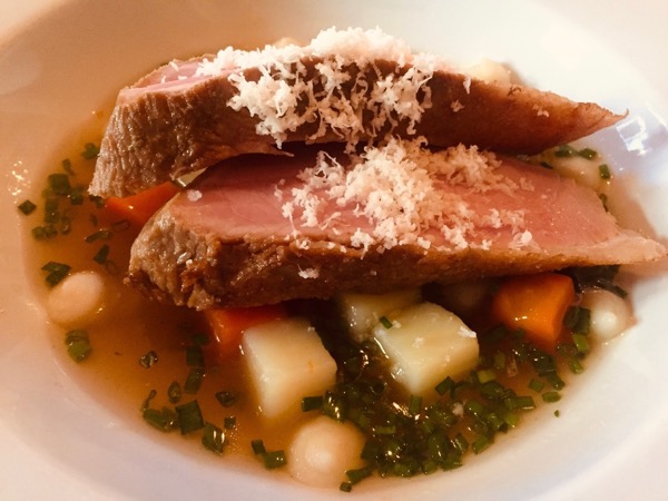 Die Speisekarte bietet gerne die Evergreens, die für die meisten Gäste als lebenswichtig gelten. Dazu gehören das wunderbare Wiener Schnitzel, das saftige Backhändel, der konfierte rosa Kalbstafelspitz und der tolle Zwiebelrostbraten. Es gibt auch immer wieder Kombinationen, die gewagt oder ungewöhnlich klingen, aber bei einem großen Küchenchef wie selbstverständlich wirken können. Ein solcher Teller ist der Duroc-Schweinebauch mit Odenwälder Handkäs, Radieschen und hauchdünnen Apfelscheiben. Eine andere Variante ist ebenfalls ein Must-have: Spanferkelbauch vom Schwäbisch-Hällischen Landschwein mit roter Wildgarnele, Blutwurst und Cannellini-Bohnen. Ganz famos außerdem die schlotzigen Ravioli mit Salsicciafüllung, feinsten Graupen und Belper Knolle im würzigen Zwiebelsud. Eines der schönsten Desserts der letzten Wochen: Aromatische Mara de Bois Erdbeeren vom Obsthof Schneider mit ausgebackener Holunderblüte und Holunderschaum.