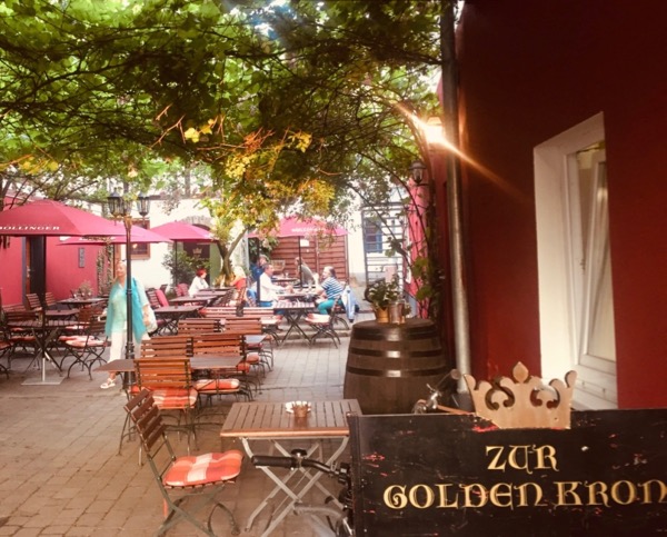 Ein schattiges, lauschiges Plätzchen im Freien mit schöner Atmosphäre? Und auch noch mit genüsslichem Essen und guten Weinen? Ja, gibt´s das denn?  Gibt es im dörflichen Frankfurter Stadtteil Alt-Eschersheim. Die Golden Kron, eines der ältesten Wirtshäuser der Stadt und einst eine einfache Apfelweinwirtschaft, ist längst als Edelwirtshaus bekannt und lockt mit lustvollen Gerichten, die Alfred Friedrich zubereitet, der einst im legendären Frankfurter Bückenkeller als Küchenchef zwei Michelin-Sterne am gastronomischen Himmel glänzen ließ.