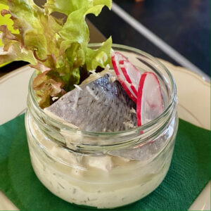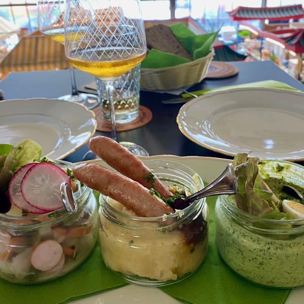 Das Lokal Daheim, in der Kleinmarkthalle oben auf der Galerie zu finden, wirkt so ganz anders als alles andere hier: Offene Küche, Kleiner netter Speiseraum, Stehhocker mit Blick auf das Geschehen in der wuseligen Markthalle. Viele Gerichte werden gerne im kleinen Einweckglas serviert, wobei es natürlich auch Teller dazu gibt. Man wird von manchen kleinen Happen überrascht sein. Die tollen Roten Bete von der Gärtnerei Rappelt werden so pikant zubereitet und köstlich kombiniert mit karamellisierten Walnüssen, Apfelwürfeln, Zwiebeln und geräucherten Forellenfilets, dass selbst Rote Bete Verächter staunen werden. Zu manchen Gerichten gibt es ein gutes Bauernbrot, auch das zeigt, wie sehr man um Qualität und Geschmack bemüht ist. Famos auch die Mini-Bratwürstchen vom Bauern Trapp, die es nur in der kleinen Version gibt. Der Wurstsalat ist klasse und wird einmal nicht mit Fleischwurst angerichtet, sondern mit würzigen und geräucherten Frankfurter Würstchen. Die Frankfurter Grüne Soße ist perfekt kräuterwürzig, wobei ein Wachtelei mehr dazu sicher vorteilhaft wäre. Der Handkäs spitze, weil er optimal gereift und von einer selten zu erlebenden Geschmeidigkeit ist. Die Vinaigrette aus Zwiebeln und Apfelwein/Apfelsaft passt bestens. Die große und die kleine Häppchenreise haben wir schon im Lorsbacher Thal schätzen gelernt. Samstags gibt es nur diese hessischen Tapas und sonst keine Speisekarte, weil der Koch allein in seiner Küche einfach nicht nachkäme. Auch deshalb gibt es einiges nur zum Mitnehmen im Glas, etwa die Königsberger Klopse. Bernd Schweizer hat inzwischen Verstärkung im Service bekommen, der Run auf die Buletten und das ganze Sortiment ist vor allem freitags und samstags groß.