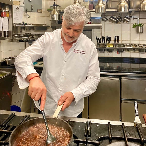 So gut eine Bolognese auch sein kann, uns ist sie meist zu fett, zu trocken oder durch den Einsatz von Tomatenmark zu säuerlich. Leo Caporale vom Ristorante Brighella in Frankfurt macht für uns ein umwerfend gutes Ragout zur Pasta. Es ist dem alla Bolognese ähnlich und doch ganz anders. Leo nennt es deshalb auch Kalbs/Rinder-Ragù. Es ist saftig, bestens gewürzt und intensiv im Geschmack. Es ist auch nicht fettig oder wird nach einer Weile trocken. Es ist einfach ganz wunderbar. Das Ragout besteht aus Rind und Kalb, unter Beachtung der unterschiedlichen Garzeiten (in der original Bolognese werden Fleisch von Schwein und Rind und auch Wurstreste sowie anderes mehr verwendet). Küchenchef Leo stützt sein Gericht auf Gemüsebrühe und schmeckt mit den Zutaten Sellerie, Karotten, Zwiebeln, Thymian, Salz und Pfeffer ab. Im Gegensatz zur Bolognese wird bei ihm kein Tomatenmark und auch kein Wein verwendet. Tomatenmark und Wein machen eine Bolognese säuerlich, weshalb zur Eindämmung Milch verwendet wird. Das Ragù im Brighella wurde von all diesen Störfaktoren befreit. Es ist kraftvoll, fleischig und ganz gezielt auf den reinen harmonischen Geschmack ausgerichtet.