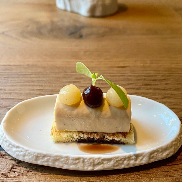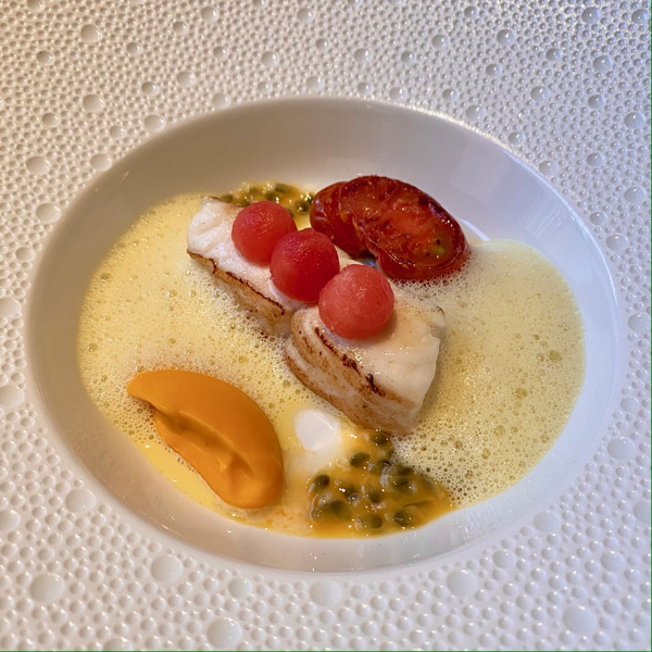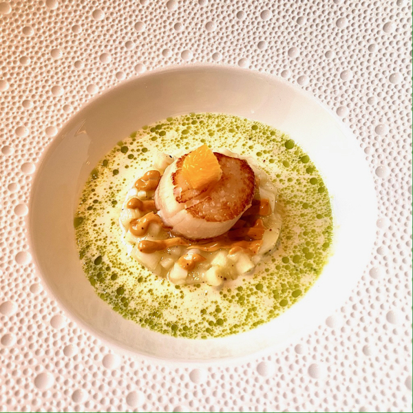 Einer unserer Favoriten auf der neuen Karte ist die Jakobsmuschel mit Seeigelcreme, einer feinen Interpretation der Frankfurter Grünen Soße sowie einem Stück sizilianischer Orange on top. Erstklassig auch der Steinbutt mit softer Karottencreme, Wassermelone, Maracuja-Jus und in Salz gegarten sizilianischen Tomaten mit Safran-Fenchel-Schaum. Kombinationen mit Obst mögen wir sonst weniger, aber hier ergibt sich ein großes harmonisches Geschmackbild von subtiler Güte. Stets ein Highlight sind die phantasievoll präsentierten Gaumenhäppchen zum Start, Gänseleber mit Birnengele und Portweinreduktion oder Saiblingsmouse mit Räuchernote nebst Saiblingskaviar und Saiblingstatar.