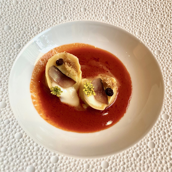 Mehr Sizilien auf dem Teller. Diese neue Tendenz beim Spitzenitaliener Carmelo Greco erfüllt sich in besonderer Weise bei den Tortelli. Die Pasta ist gefüllt mit einer spannenden Melange aus Wildfenchel, Sardellen, Safran, Zwiebeln und Pinienkernen. Die pikante Sauce aus Tunfisch, Zwiebel, Erbse und Tomate grundiert mit süffiger Raffinesse. Genau solche Gerichte hat man sich schon immer mehr bei Carmelo Greco gewünscht, mit solchen und ähnlichen Gerichten könnten sich auch andere Italiener aus der Masse hervorheben.