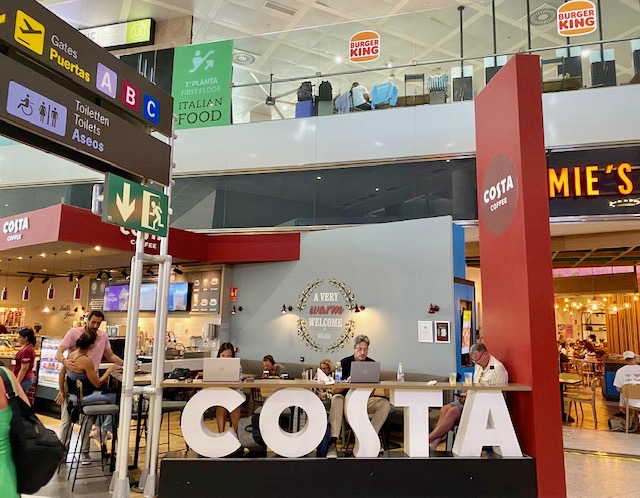 Einen guten Kaffee findet man nicht und schon gar nicht so einfach im Vorbeigehen auf dem Flughafen, der bei Costa ist der beste, den wir kennen, wobei man ihn in angenehmer Umgebung trinken kann.