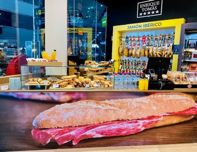 Der zur Zeit angenehmste Ort am Aeropuerto Málaga ist das „foodies“ von Enrique Tomás, unter dessen Namen rund 100 Filialen in Spanien und darüber hinaus betrieben werden. Frisch aufgeschnittener iberischer Schinken in unterschiedlichen Qualitäten bis hin zum gereiften Bellota, gute Käse, schöne Cava wie Perelada (preiswert) und Gramona (teurer aber immer noch preiswert) und andere feste und flüssige Delikatessen mehr kann man in ruhiger Atmosphäre genießen, weil der Massentourist hier nicht angesprochen wird.