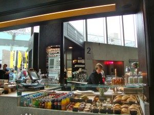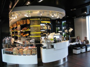 Zu den besseren Adressen am Flughafen gehört nach wie vor Le Pain Quotidien. Das „Täglich Brot“ gibt es allerdings zu nicht alltäglichen Preisen, ein Croissant verschlingt beispielsweise 1,80 Euro. Man möchte so etwas wie die großväterliche Backstube von einst auf unsere Zeit übertragen. In dem Lokal erwartet die Gäste neben Einzelplätzen ein sehr großer blanker Holztisch, der für Gastlichkeit und Geselligkeit steht. Dort soll eine offene Gesprächsatmosphäre herrschen, ähnlich dem Frankfurter Ideal der Apfelweinlokale, wo man sich auch nicht vereinzelt, sondern mischt. Das helle Holzmobiliar im Landhausstil gibt eine klare ruhige Linie vor, die das eher hektische Umfeld etwas ausbremst. Neun verschiedene gute Hausbrote sind zu haben, die sich größtenteils durch eine rösche Kruste auszeichnen. Da in der kleinen Küche zu wenig Platz für alle notwendigen Gerätschaften ist, werden die vorgefertigten Produkte wieder aufgebacken, was aber nichts an deren Qualität und Frische ändert. Sehr gut fallen auch das buttrige Croissant und die Brioche aus. Empfehlenswert zudem Oliven- und Walnussbrötchen. Unter den Tartines, zumeist in Öl gerösteten Brotscheiben, gibt es leichte mit Tomaten oder furchtbar wuchtige mit gereiftem Gruyère. Am besten schmeckt die große und mit Ziegenkäse überbackene Knusperscheibe, bei der Birnen und Akazienhonig für aparten Kontrast sorgen.