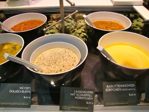 Delicut ist jedenfalls genauso eine Bereicherung für den Rhein-Main-Airport, wie der neue kleine nette Imbiss von Meyer Feinkost. Er hat sich in der Abflughalle neben der Edelboutique Burresi Platz geschaffen (früher war dort ein Café). Die schöne Linsensuppe mit Schnippelwürstchen, das Karotten-Ingwer-Süppchen und die gute Gulaschsuppe kennt man von Meyers auf der Freßgass. Husumer Krabben-Salat und Chicken Ceasar Salat sind ebenfalls eine Empfehlung, die Paninis sind wohlwollend belegt. Brot und Brötchen sind von guter Qualität. Offeriert werden zudem frisch gepresste Säfte, wobei der aus Apfel, Fenchel, Orange und Karotte am interessantesten ausfällt. Kaffee und Cappuccino sind tadellos. Man hat das Bestmögliche aus den kleinen Verhältnissen gemacht, die Gäste sitzen jedoch innen sehr eng und können sich schon mal auf die Platzsituation im Flugzeug einstimmen. Bequemer und großzügiger sitzt man im Loungemobiliar vor dem Ladenlokal.